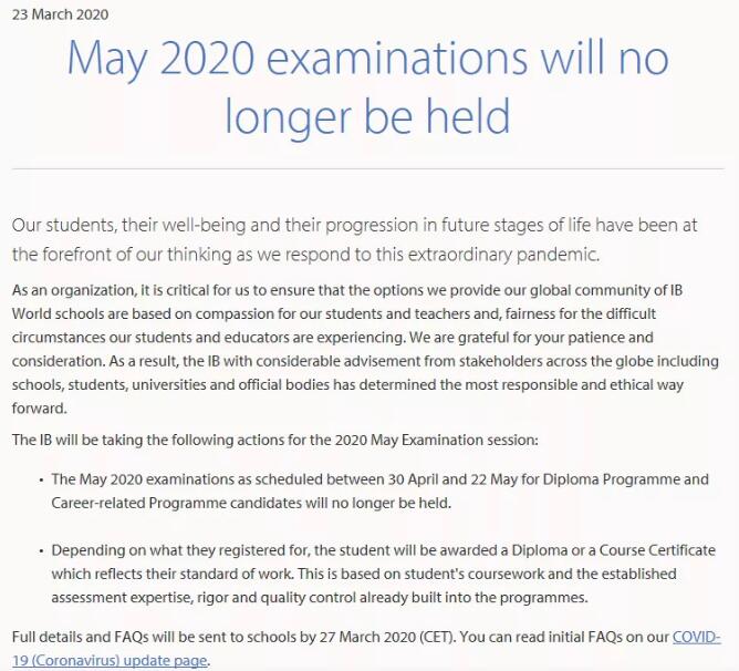 而根據(jù)IBO向?qū)W生及家長發(fā)出的郵件指出將會在3月27日前進(jìn)一步宣布如何在現(xiàn)行條件和評估原則下進(jìn)行評估,建議各位同學(xué)要持續(xù)關(guān)注IBO官方更新。