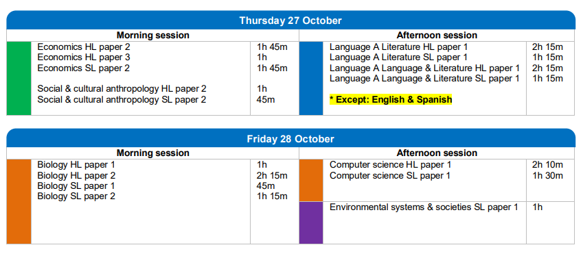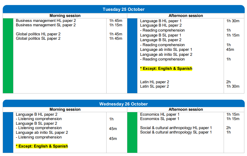 Please note that for Studies in language and literature and Language acquisition, English and Spanish are scheduled individually from all other languages.