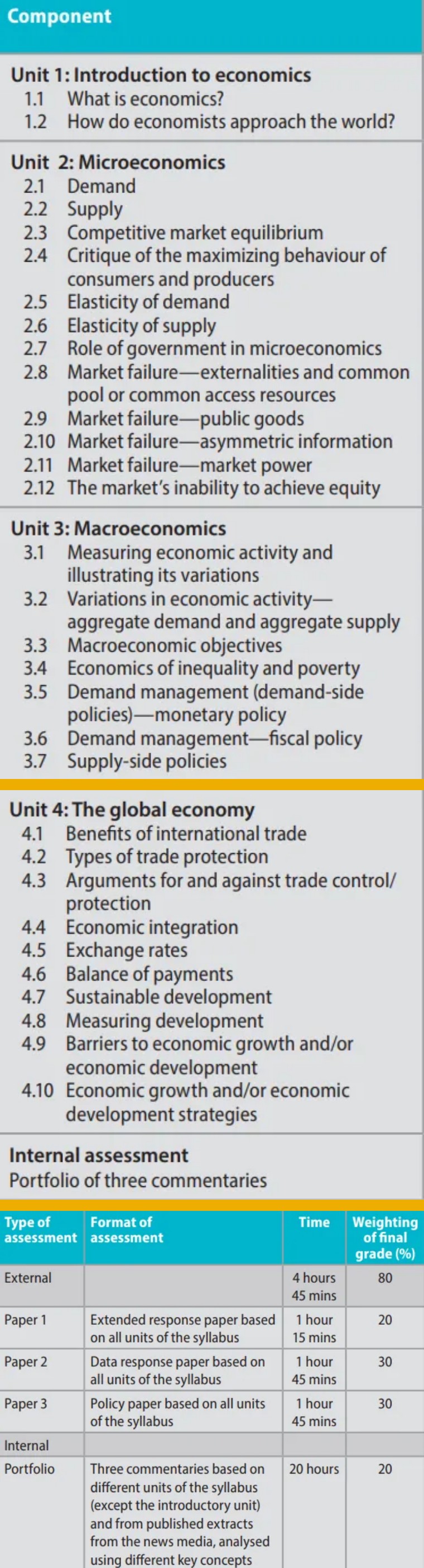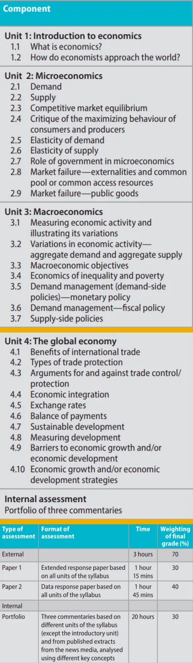 IB經(jīng)濟(jì)主要學(xué)習(xí)四部分內(nèi)容微觀經(jīng)濟(jì)學(xué)、宏觀經(jīng)濟(jì)學(xué)、國(guó)際經(jīng)濟(jì)學(xué)、發(fā)展經(jīng)濟(jì)學(xué)。HL需要額外學(xué)習(xí)計(jì)量經(jīng)濟(jì)學(xué)和福利經(jīng)濟(jì)學(xué)。