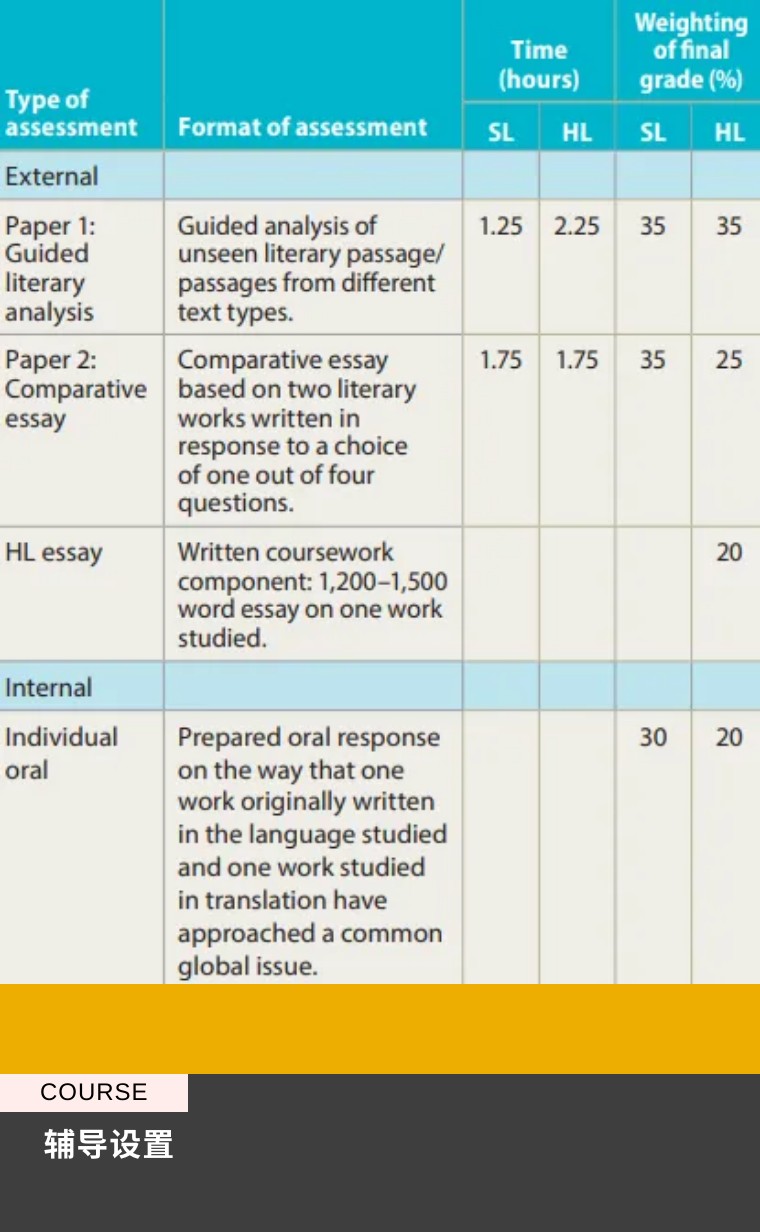 這個要求是同時針對HL和SL學生的,但是HL學生還有額外任務——他們必須再用10分鐘時間評論所學的詩詞作品并回答后續問題。口試內容將被錄音,之后寄送IB,有校外考官進行評估,分數占學生IB中文A總分數的35%(HL25%)。